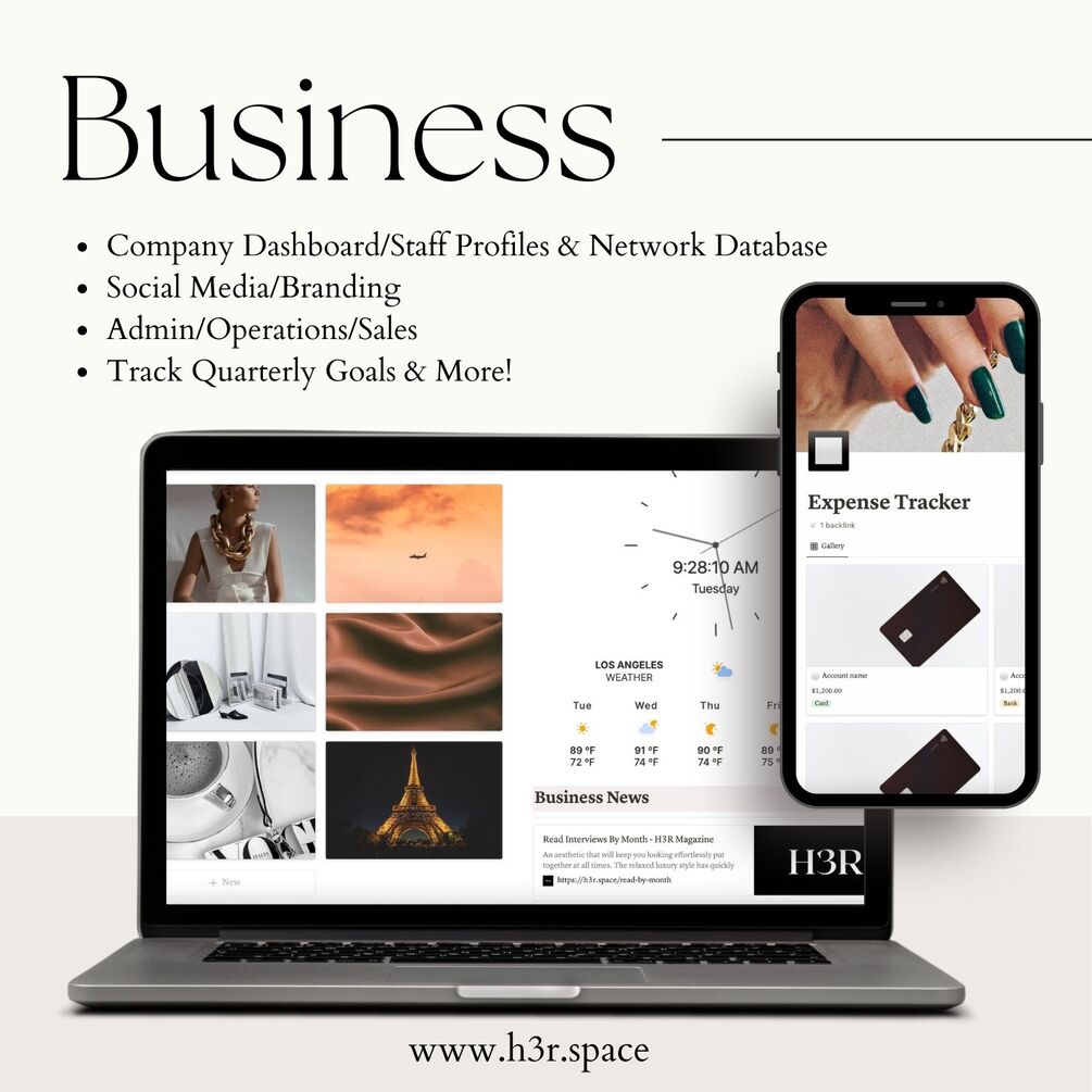 Daily Business News, Content Brainstorm Box, Master Calendar, Staff Dashboards, Company Goals, Quarterly Goals, Social Media Planners, Branding/Marketing Pages, Lead Tracker Database, Admin Organization, Company Culture Outline, Network/Contacts Database Book/Video Library, Finance Page, Legal Page, OKR/KPI Database, H3R Exclusive Interviews/Articles & More!