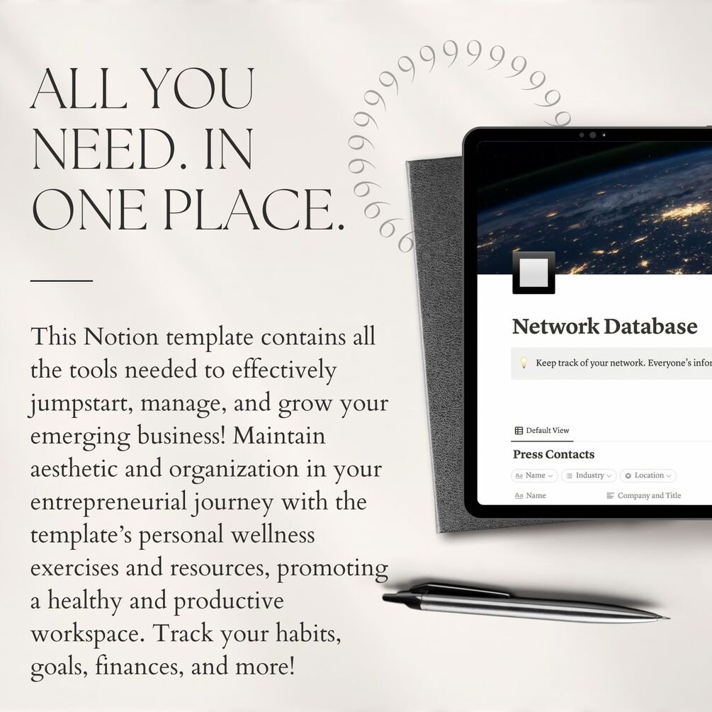 Start and scale your business from scratch while keeping your team organized and focused on accomplishing tasks and goals. This template will help you maintain aesthetics and organization throughout your entrepreneurial journey and covers the top three most important areas of an entrepreneur's life: business, personal wellness, and balance. Organize your personal wellness habits and goals as well as every aspect of your business from marketing to finances to sales and day-to- day operations.